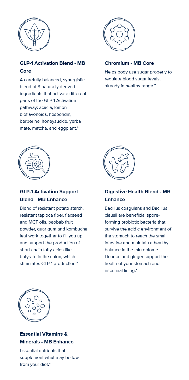 - MB Core™ has 8 carefully selected botanical extracts that work synergistically to directly stimulate GLP-1 production. *